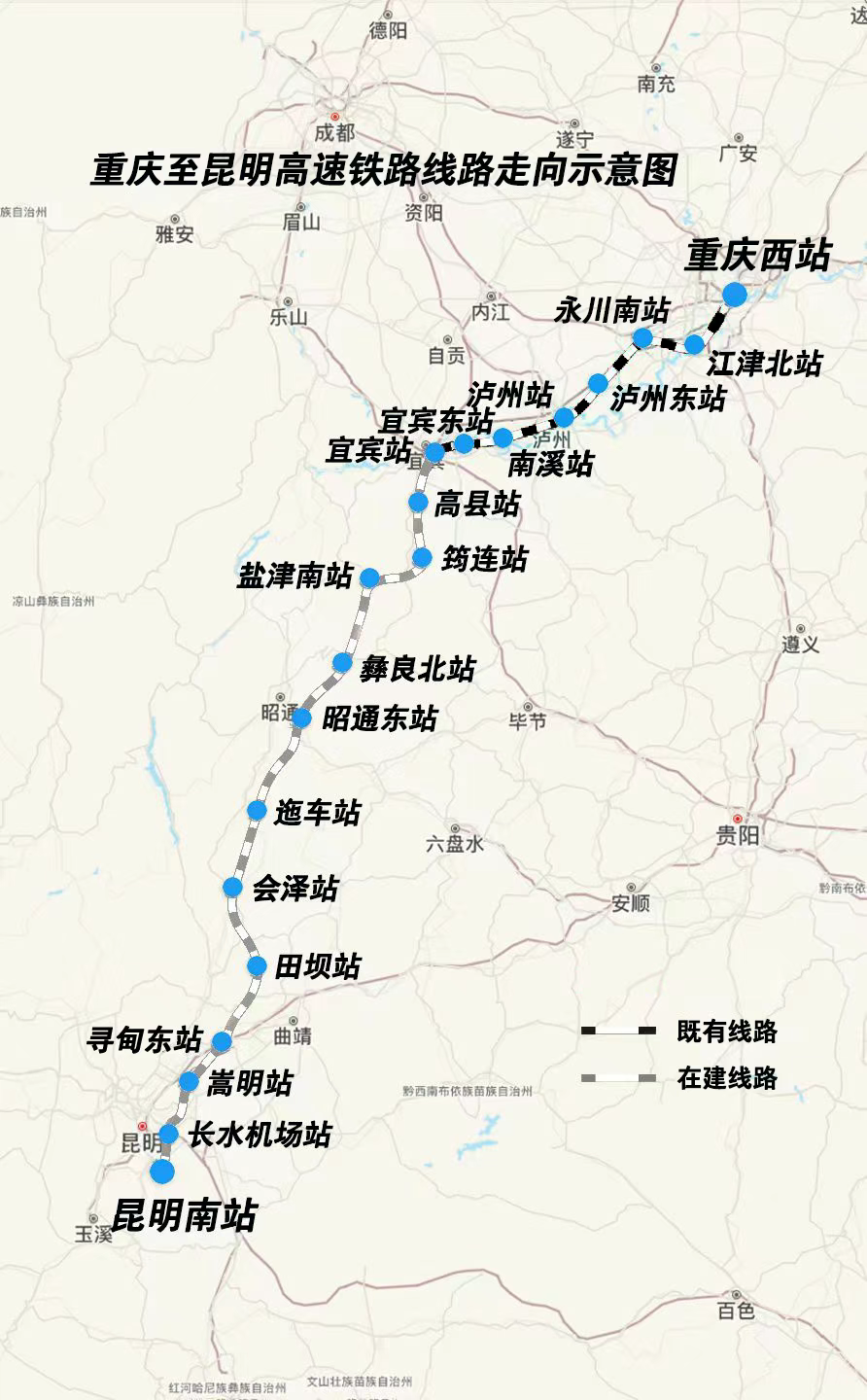 渝昆高铁是我国“八纵八横”高铁网京昆通道的重要组成部分,起自重庆西站途经重庆、四川、贵州、云南四省市终到昆明南站,全长约700公里,设计时速350公里。